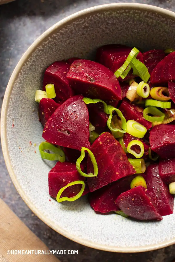 Beet Salad featuring soft beet chunks is so naturally yummy, light, and easy to make. A splash of apple cider vinegar and hemp seed oil serves as the beet salad dressing base. The delicious and nutritious spices coriander seeds and fennel seeds powder are all you need as the seasoning. The chopped green onion not only provides a beautiful contrast of color. It also complements the flavor and texture so well.