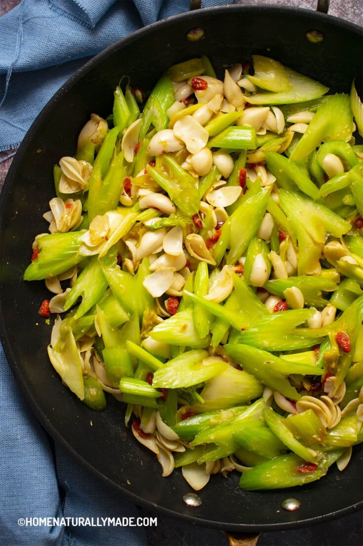 Celery with Lily Bulb and Goji stir fry is classic Chinese vegetarian food. It perfectly combines color, texture, taste, and nutrition in one pan. It features green crunchy celery that has a herbal flavor. The white and nutty lily bulb gives you this satisfying firm bite feeling, but also a hint of bitterness. Red soft Goji berries balance the whole dish with semi-sweetness.