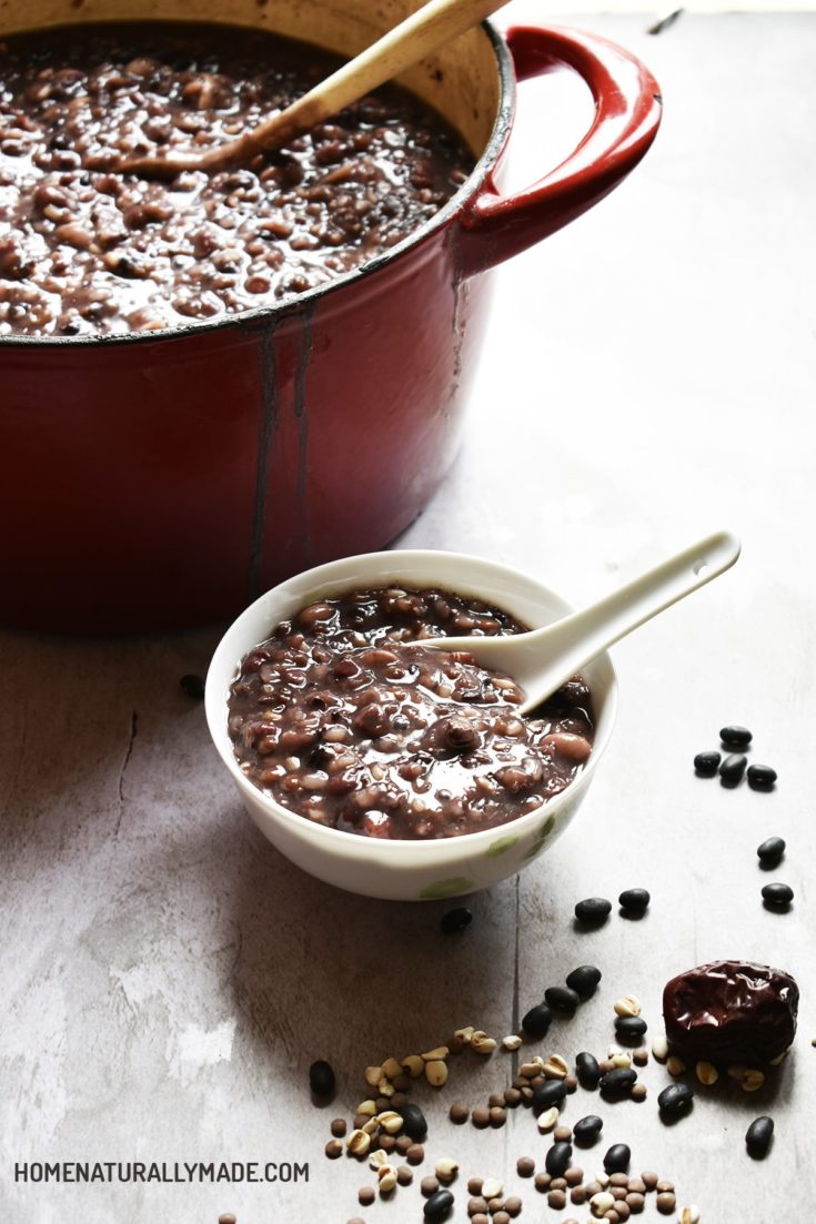 It is a combination of mother nature’s best grains, legumes, seeds, and additional goodies such as red jujubes, Goji berries, or dried lily bulb, slow cook together with water for 2 hours or more. The slow cooking process creates magic and turns the mixture into this smooth, gooney, and melt-in-your-mouth yumminess, which is super easy for the body to digest.