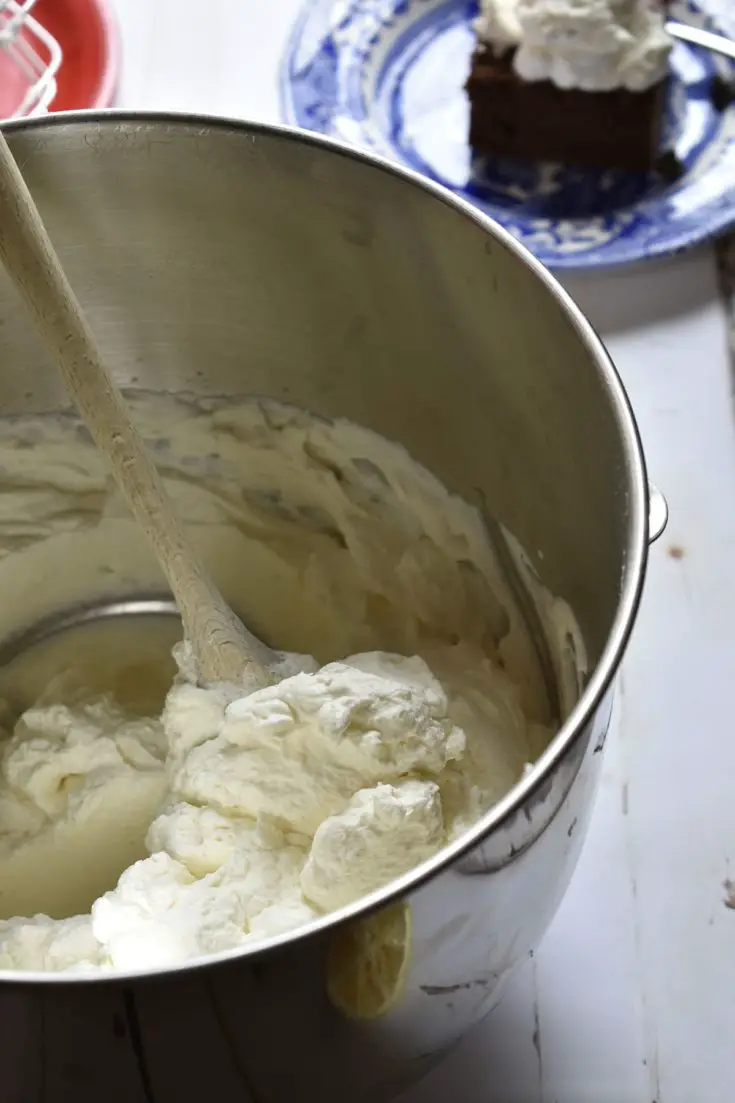 Add heavy cream and vanilla extract into the mixing bowl and sift in the confectioners’ sugar. Turn the speed to medium-high and whisk for 5 minutes or until the cream peaks.