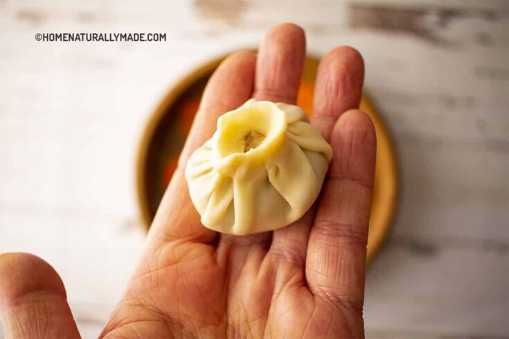 Continue to pleat & pinch counter-clockwise. When you are almost halfway through, rotate the wrapper on your left hand clockwise. This way, it is easier for your right hand to fold the remaining wrapper.