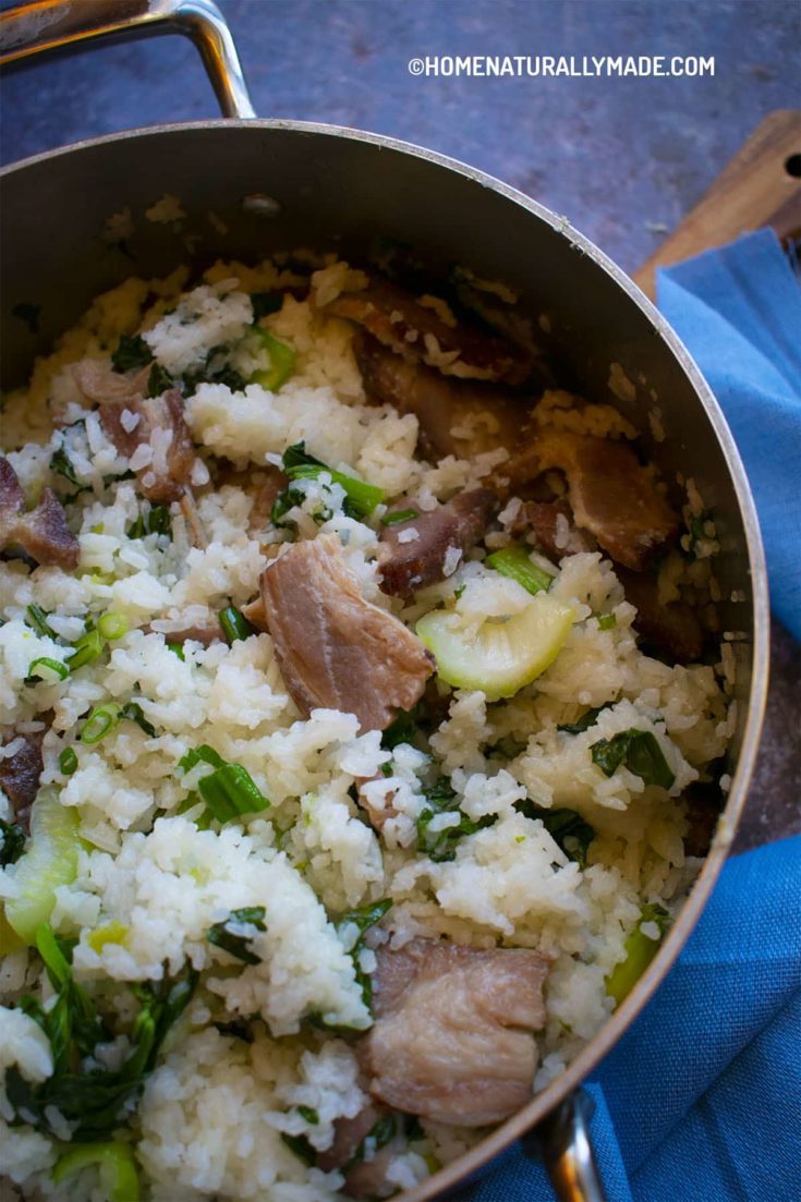 It is completely optional whether you want to stir-fry or briefly blanch the bok choy first before adding it into the pot. I usually bring the meat and rice to a boil, and then fold the chopped fresh bok choy into salted pork and rice and let it simmer. It works well. The salted pork has ample salt and oil for the bok choy and the entire meal.