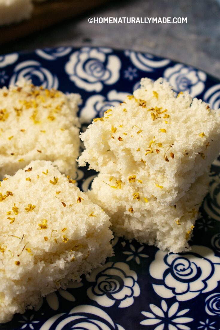 Song Gao {松糕} is a traditional Chinese sponge rice cake made of a combination of sweet rice flour and rice flour. They are so refreshing, spongy, light, and yummy, also naturally vegan and gluten-free. It uses extremely simple ingredients too. Besides the two types of rice flour, all you need is cane sugar and water. Dried osmanthus flowers, or Gui Hua {桂花} in Chinese, are an optional but highly recommended garnishing item.